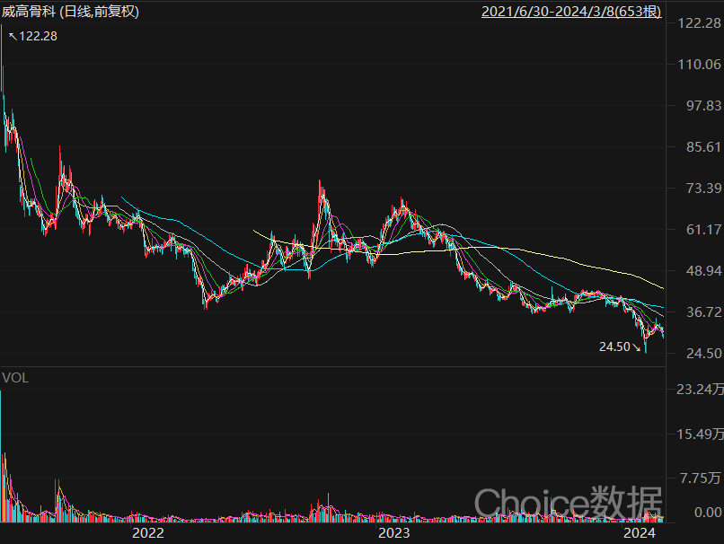 从二级市场来看,威高骨科“出道即巅峰”,其股价在上市首日触及122.28元/股的最高点,截至3月8日收盘时报28.97元/股,累计跌幅达76.31%,对应市值蒸发超过373亿元。