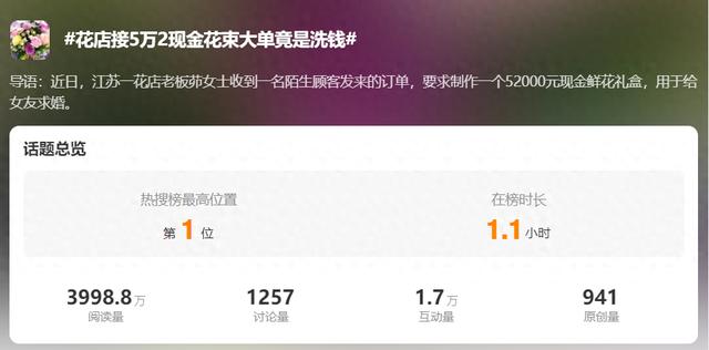 相关词条#花店接5万2现金花束大单竟是洗钱#一度冲上微博热搜首位。