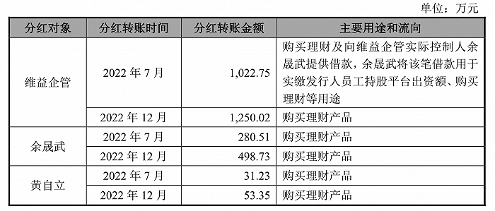 根据晟威机电的回应,5000万元的分红是为了回报股东,与此同时,晟威机电的股东及实际控制人维益企管、余晟武、黄自立、成婷欠付晟威机电资金占用款1722.37万元。这次的分红也是为了解控股股东、实际控制人资金占用问题。那么在扣除占用的资金之后,实际发放的分红买了理财产品等。