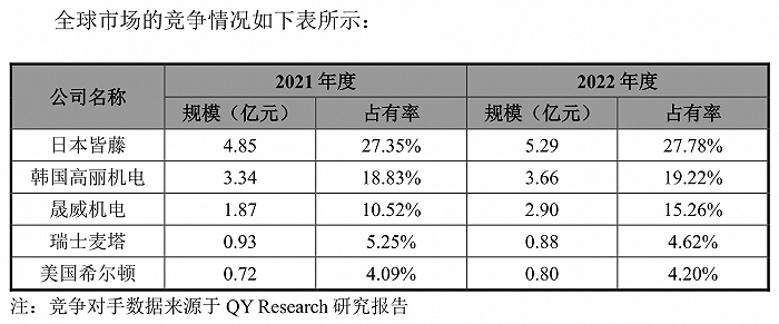这一方面说明公司在行业中具有一定竞争力,同时市场竞争的激烈也可想而知。根据晟威机电自己预测,以2022年公司国内市占率39.17%为例,若公司国内市场份额下降5个百分点,营业收入和净利润将下降11.21%;若公司国内市场份额下降10个百分点,营业收入和净利润将下降22.43%。