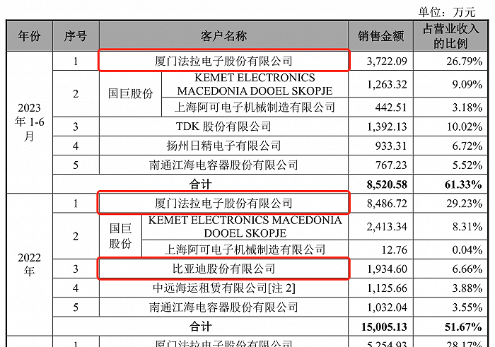 公司2023年上半年前五客户合计的销售金额占营业收入比例61.33%,2020年至2022年的比例分别为49.05%、55%、51.67%,可见公司客户集中度较高。这其中,法拉电子(600563.SH)为第一大客户,2023年上半年比例为26.79%。法拉电子在2020年时的销售金额为229.26万元,到2023年上半年飙涨至3722.09万元。