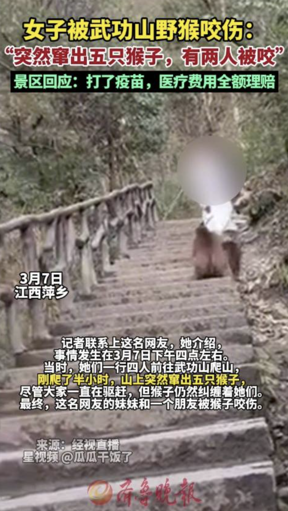 3月7日,江西萍乡,有网友称在武功山游玩时遭野猴袭击,腿部被咬伤,事后注射了狂犬疫苗及破伤风针。据该网友介绍,当日她们一行四人前往武功山爬山,途中山上突然窜出五只猴子,尽管大家一直在驱赶,但猴子仍然纠缠着她们。最终,这名网友的妹妹和一个朋友被猴子咬伤。3月8日,记者联系上武功山风景区,工作人员介绍,这名游客所说属实,有工作人员对野猴进行驱赶。游客进入景区前一般都会被建议购买保险,游客若遇袭击可先到就近医务站处理,注射疫苗可走保险报销。