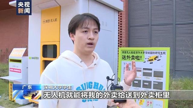 深圳大学学生:支付成功以后,大概十几分钟,无人机就能将我的外卖送到外卖柜里。
