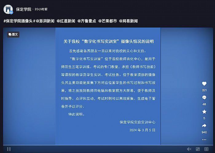 近日,有学生发视频称,保定学院一教室内布满摄像头,上课压力大引起热议。3月5日,河北保定学院实验实训中心发布关于该校“数字化书写实训室”摄像头情况的说明称,“数字化书写实训室”位于该校教师育化中心,是用于师范生三笔字训练、考试的专门教室,承担《教师书写技能》等课程的教学及学生实训、考试任务。位于教室顶部的摄像头其主要功能是采集下方对应位置学生的书写过程和书写效果,将之投放到教师用电脑和教室前方大屏幕,便于教师及时指导、点评和互动,考试时则可以高效采集、生成电子答卷并予以评分。