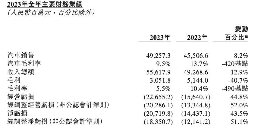 财报显示,2023年全年,蔚来共交付160038辆新车,同比增长30.7%。全年总收入为556.179亿元,比上年增长12.9%。2023年全年调整后的净亏损(非公认会计原则)为183.57亿元,比上年增长51.1%。全年公司毛利率为5.5%,而2022年为10.4%;同期整车毛利率9.5%,2022年为13.7%。