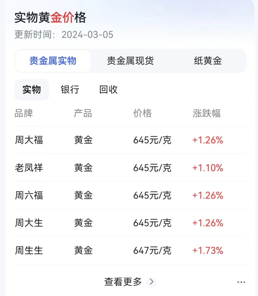 据黄金价格查询网站显示,3月5日,周大福、周生生、六福珠宝、周六福、老凤祥等国内大部分黄金珠宝品牌,其足金首饰价格都达到645元/克,甚至更高,较上一日普遍涨超1个多百分点,达到历史高位水平。