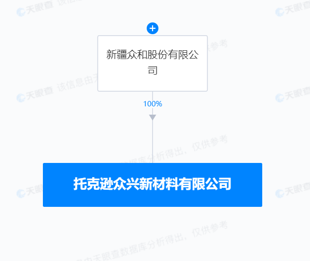 天眼查显示,近日,托克逊众兴新材料有限公司成立,法定代表人为边明勇,注册资本1000万元,经营范围包含:有色金属合金制造;高性能有色金属及合金材料销售;有色金属铸造;新材料技术研发等。股权穿透显示,该公司由新疆众和全资持股。