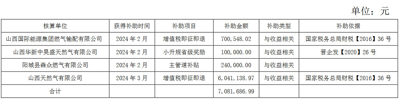 3月4日,国新能源(600617)发布公告称,自2024年1月27日起截止到本公告日,公司下属公司已累计收到与收益相关的政府补助合计金额为人民币7,081,686.99元,占公司最近一期经审计归属于上市公司股东净利润的11.12%。具体补助情况如下: