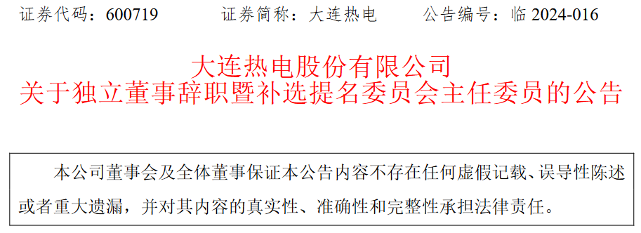 3月4日,大连热电(600719)发布公告称,大连热电股份有限公司(以下简称“公司”)董事会于2024年3月4日收到公司独立董事刘玉平先生递交的书面辞职报告,刘玉平先生因连续任职超过6年,根据《上市公司独立董事管理办法》规定,申请辞去公司独立董事职务、公司提名委员会主任委员及战略与可持续发展委员会委员职务,辞职后不再担任公司任何职务。刘玉平先生确认与公司董事会无任何意见分歧,也无任何与辞任有关的事项需提请公司董事会及股东与债权人注意的情况。