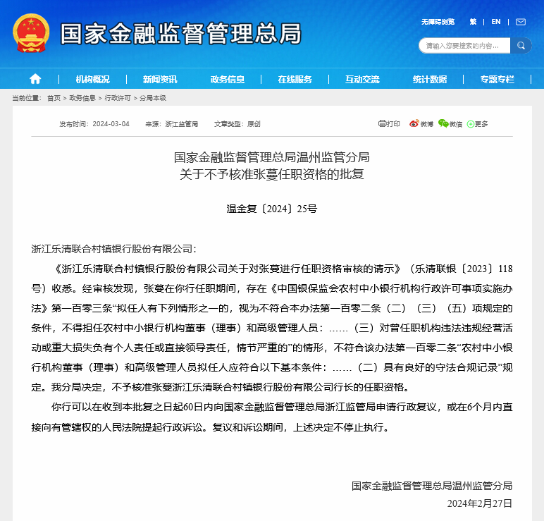 3月4日下午,国家金融监督管理总局温州监管分局发文称,不予核准张蔓浙江乐清联合村镇银行股份有限公司行长的任职资格。