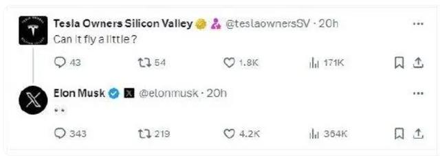 特斯拉硅谷车主俱乐部的账号询问:“它能飞一点吗?”马斯克回复了一个“眨眼”的表情符号。