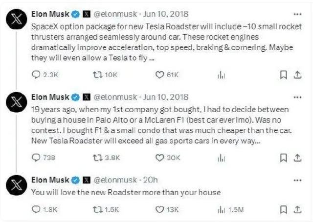 马斯克在这两条旧推文下评论称:“你们喜欢新的Roadster会超过喜欢你的房子。”