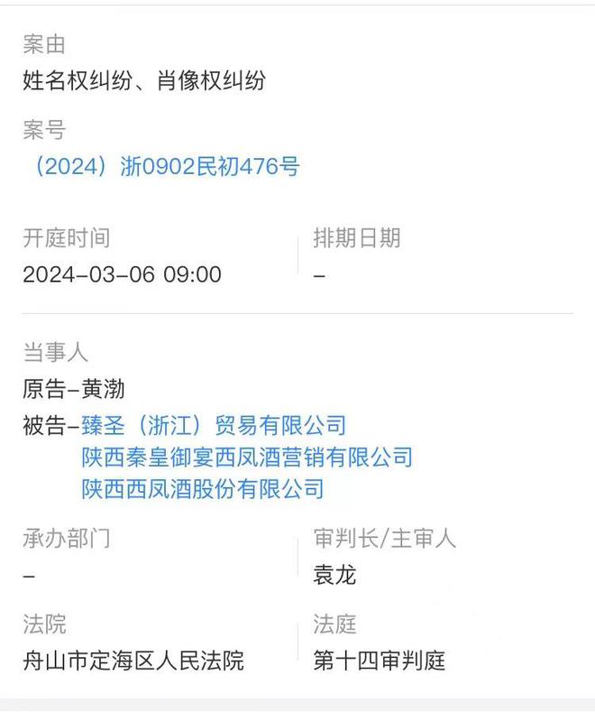 近日,黄渤与臻圣(浙江)贸易有限公司、陕西秦皇御宴西凤酒营销有限公司和陕西西凤酒股份有限公司相关姓名权纠纷、肖像权纠纷案件新增开庭公告。