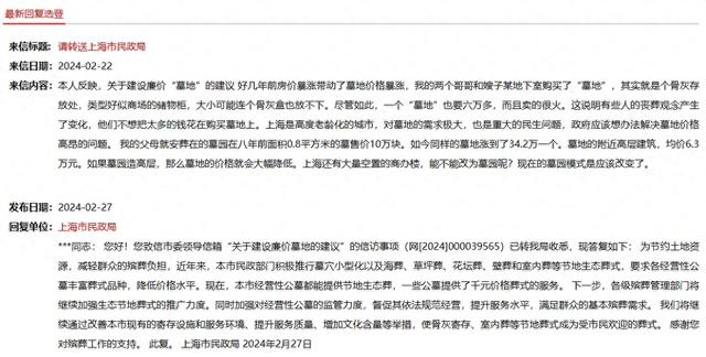 近日,有网友在上海市委领导信箱留言称,希望政府想办法解决墓地价格高昂的问题。