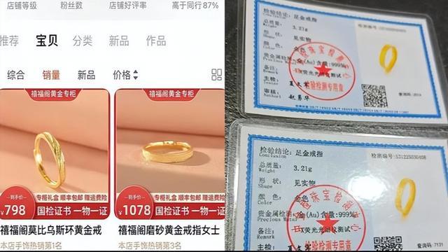 据悉,郑女士曾花费3000多元在某宝平台上的禧福阁黄金店铺购买了一对黄金戒指,商家还附带了戒指的鉴定证书,声称戒指为999足金,重量约为3克多。然而,令人意想不到的是,戒指在不久后便开始褪色。为了弄清真相,郑女士将戒指送至专业机构进行检验,结果却显示戒指的纯度仅为14k,约等于585,重量也仅为2克多。