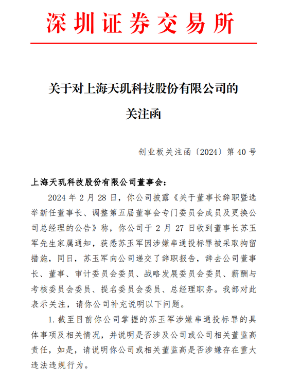 2月28日,天玑科技公布上述事项后,深交所创业板公司管理部向公司发出关注函。