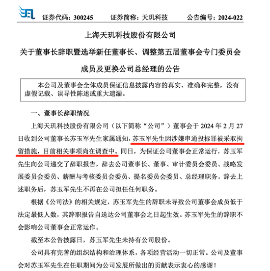 天玑科技公告提到,公司董事会于2024年2月27日收到董事长苏玉军家属通知,苏玉军因涉嫌串通投标罪被采取拘留措施。