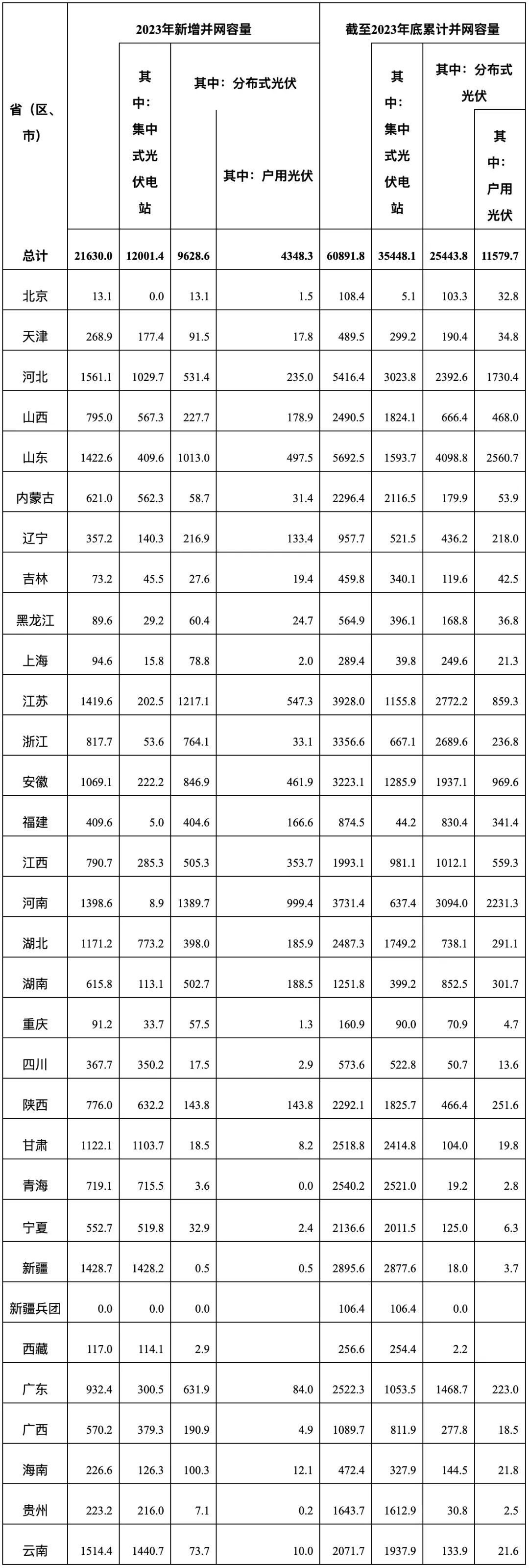 2月28日,国家能源局发布2023年光伏发电建设情况。2023年,全国新增并网容量21630.0万千瓦。其中,集中式光伏电站12001.4万千瓦,分布式光伏9628.6万千瓦,户用光伏4348.3万千瓦。