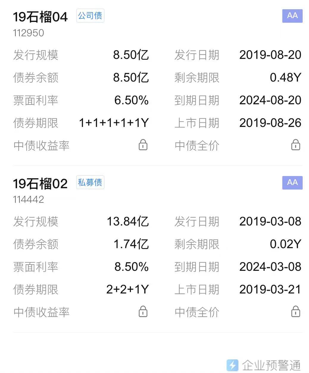 据企业预警通,石榴集团目前债券存量规模是10.24亿元,均为1年内到期。其中,“19石榴02”私募债余额1.74亿元,发行日期是2019年3月8日,票面利率8.5%,即将于2024年3月8日到期。