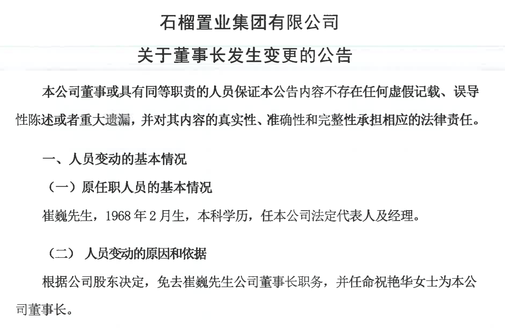 2月27日晚间,深交所发布《石榴置业集团有限公司关于董事长发生变更的公告》显示,石榴置业集团有限公司(以下简称石榴集团)原法定代表人及经理崔巍被免职,不再担任董事长一职。祝艳华被任命为新任董事长。