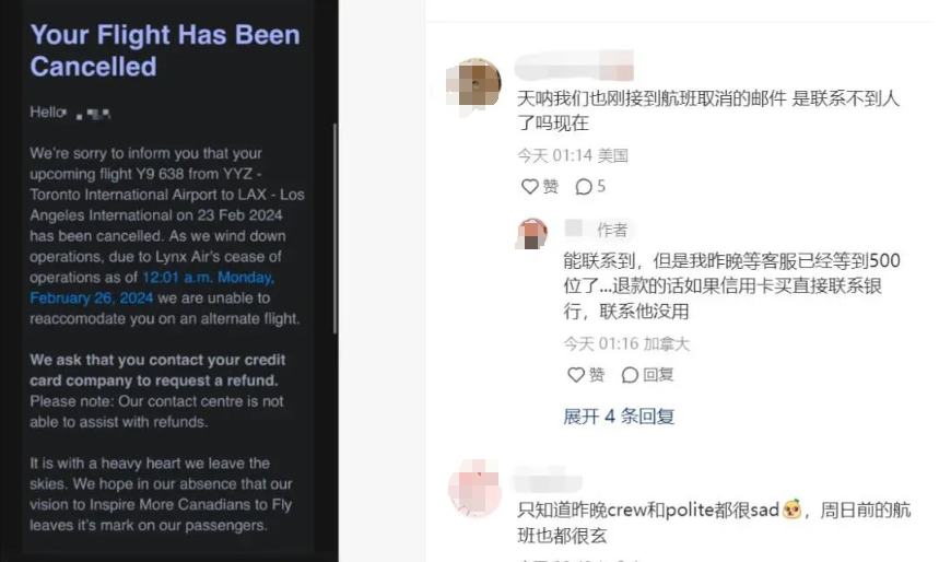 Lynx Air称,公司的经营困难,与加拿大市场的通货膨胀,竞争激烈,燃料成本,汇率及监管成本有关,而在公司停运后,公司的联络中心将无法帮助退款。