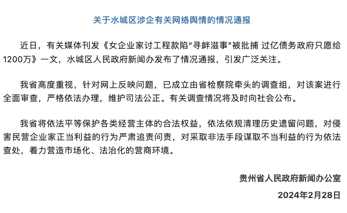 “贵州发布”消息,近日,有关媒体刊发《女企业家讨工程款陷“寻衅滋事”被批捕 过亿债务政府只愿给1200万》一文,水城区人民政府新闻办发布了情况通报,引发广泛关注。贵州省高度重视,针对网上反映问题,已成立由省检察院牵头的调查组,对该案进行全面审查,严格依法办理,维护司法公正。有关调查情况将及时向社会公布。贵州省将依法平等保护各类经营主体的合法权益,依法依规清理历史遗留问题,对侵害民营企业家正当利益的行为严肃追责问责,对采取非法手段谋取不当利益的行为依法查处,着力营造市场化、法治化的营商环境。