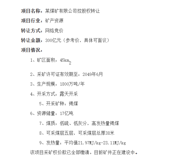 某煤矿有限公司控股权转让金额300亿元,矿区面积45km²,生产规模1800万吨/年,采矿许可证有效期至2049年6月,资源储量达到17亿吨,可采煤层五层,可采煤层总厚38米,开采矿种为低硫、低灰分、高发热量的褐煤。