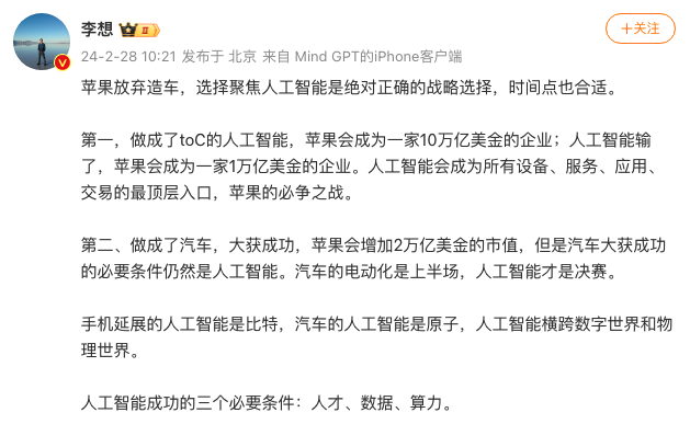 2月28日,理想汽车CEO李想发文称,苹果放弃造车,选择聚焦人工智能是绝对正确的战略选择,时间点也合适。人工智能会成为所有设备、服务、应用、交易的最顶层入口,苹果的必争之战。李想表示,“做成了汽车,大获成功,苹果会增加2万亿美金的市值,但是汽车大获成功的必要条件仍然是人工智能。汽车的电动化是上半场,人工智能才是决赛。”