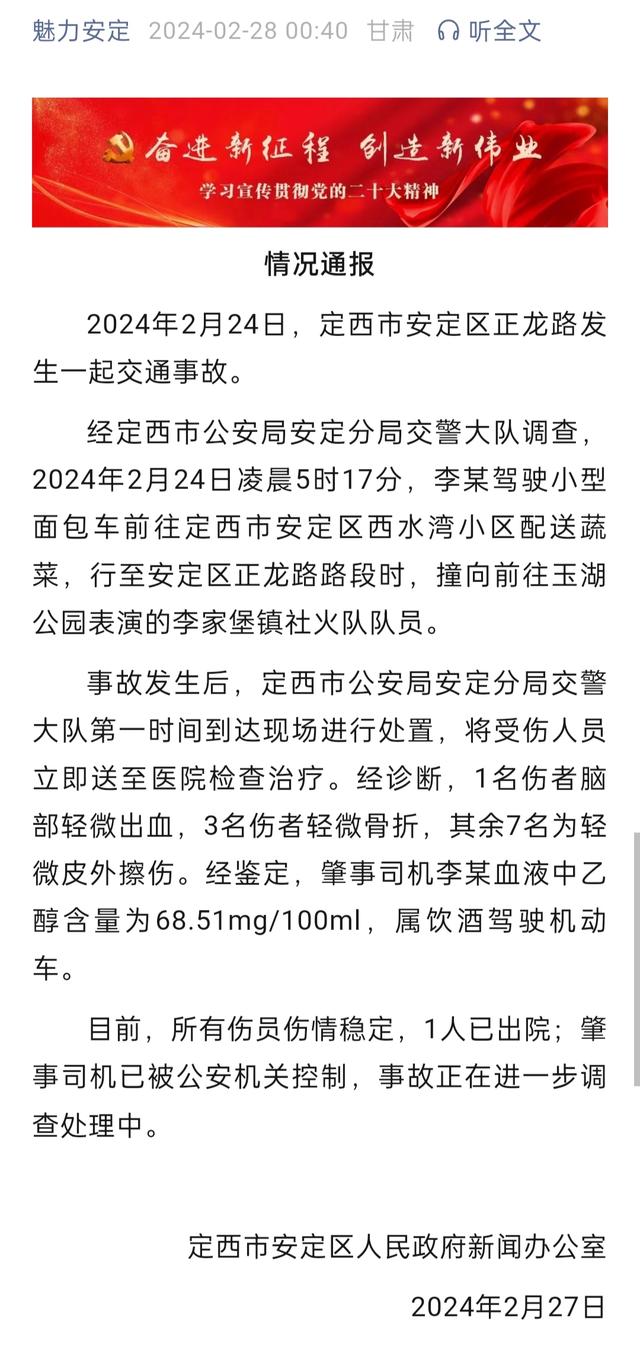 2月28日凌晨00:40,甘肃省定西市安定区委宣传部发布情况通报:2024年2月24日,定西市安定区正龙路发生一起交通事故。