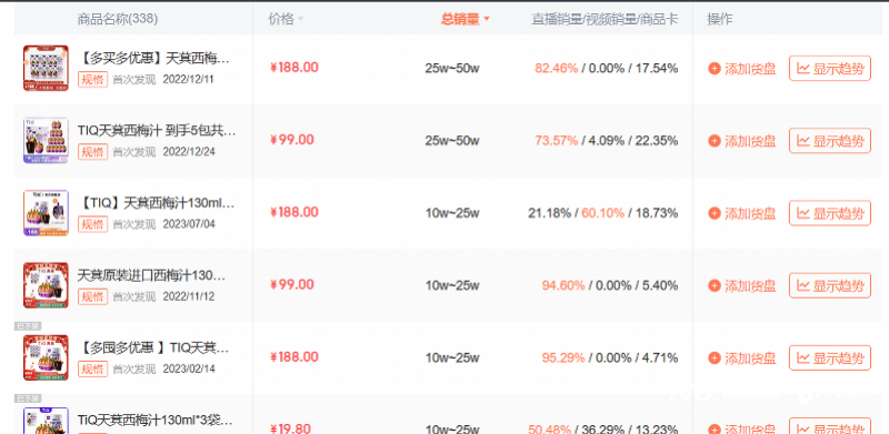 以东方甄选为例,其最早在2023年1月就开始给天萁西梅汁带货,近一年时间里,东方甄选直播间中TIQ天萁西梅汁的总销量在16万~34万件,总销售额在2000万~5000万元;再如,贾乃亮直播间最早在2023年4月7日给TIQ天萁西梅汁带货,销量达1000~2500件,销售额在25万~50万元之间。