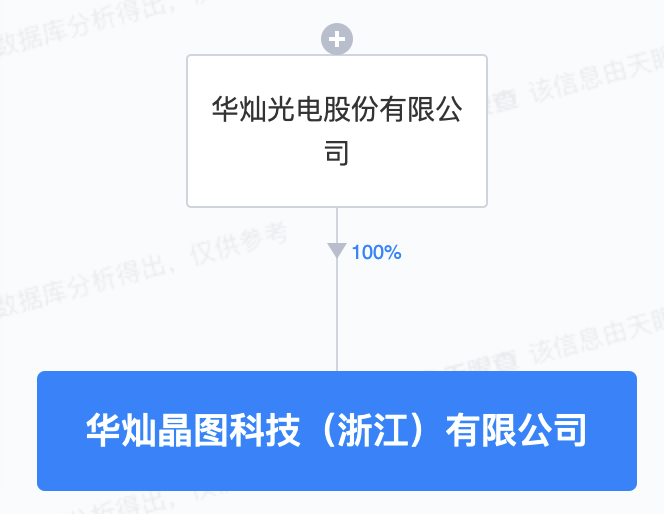 天眼查APP显示,华灿晶图科技(浙江)有限公司成立,法定代表人为蔡锋,注册资本为1亿元,经营范围包含:半导体照明器件制造;半导体照明器件销售;电子专用材料制造;半导体分立器件销售;半导体器件专用设备制造等。天眼查股权穿透显示,该公司由华灿光电全资持股。