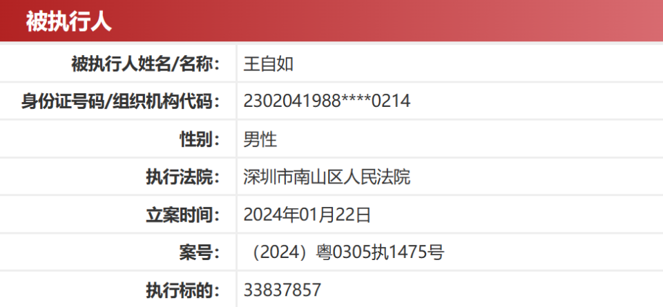 近期,中国执行信息公开网显示,王自如新增一则被执行人信息,执行标的3383万余元,执行法院为深圳市南山区人民法院。在天眼查APP上,同样能发现这条执行信息。