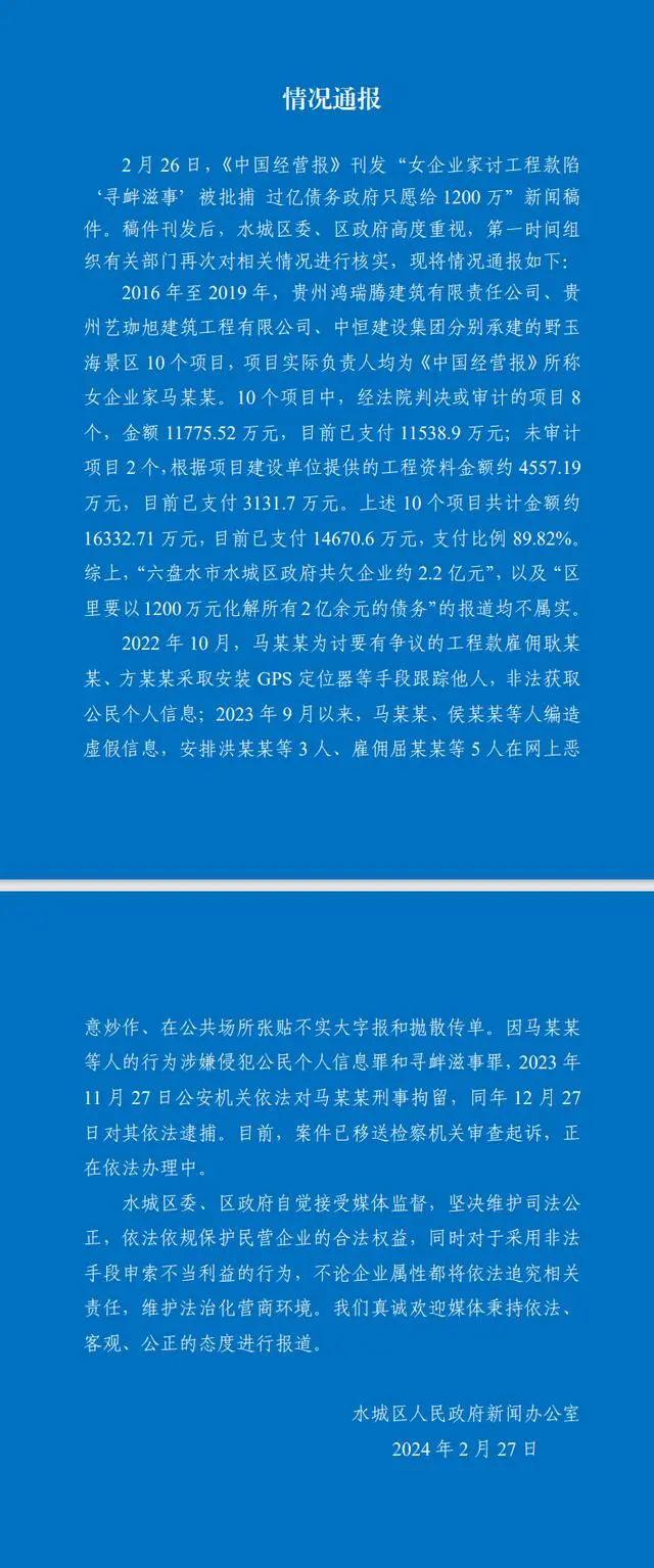 2月27日,贵州六盘水水城区政府在其官微就“女企业家讨工程款被批捕 过亿债务政府只愿给1200万”一事发布情况通报。