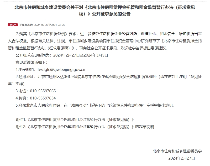 2月27日,北京市住建委会同市住房资金管理中心发布《北京市住房租赁押金托管和租金监管暂行办法(征求意见稿)》,首次拟明确将住房租金纳入监管。对于单次收取超3个月租金的住房租赁企业,需将超收租金存入第三方专用账户,且租客可自行查询租金监管账户内金额。