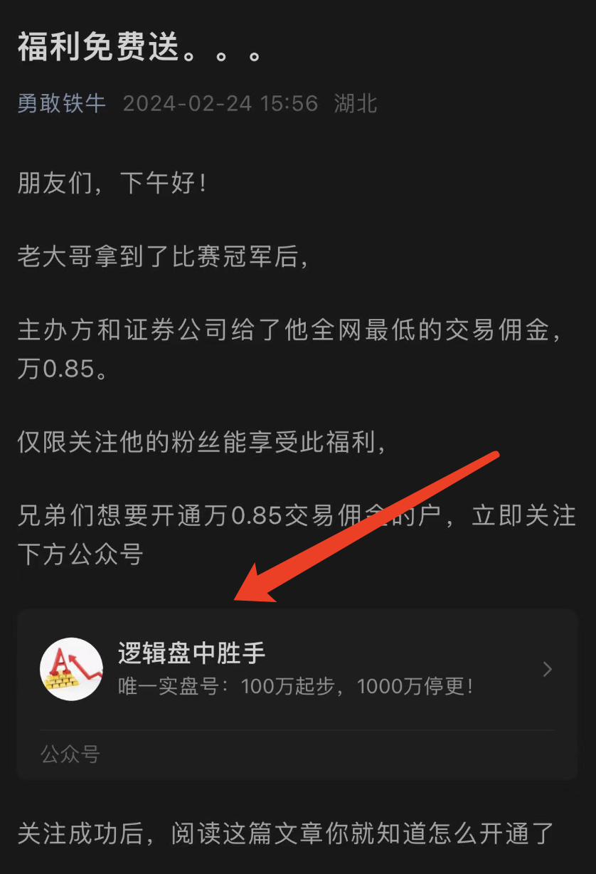 除此之外,“勇敢铁牛”还会在文章内插入链接,将粉丝导流至另一个新的公众号“逻辑盘中胜手”,以此推荐开户信息。