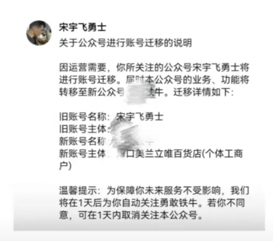 记者查询发现,“宋宇飞”口中冒用自己名义的公众号名为“勇敢铁牛”,该账号在2月10日进行了账号迁移,公号原名为“宋宇飞勇士”,后经更改才变为“勇敢铁牛”。
