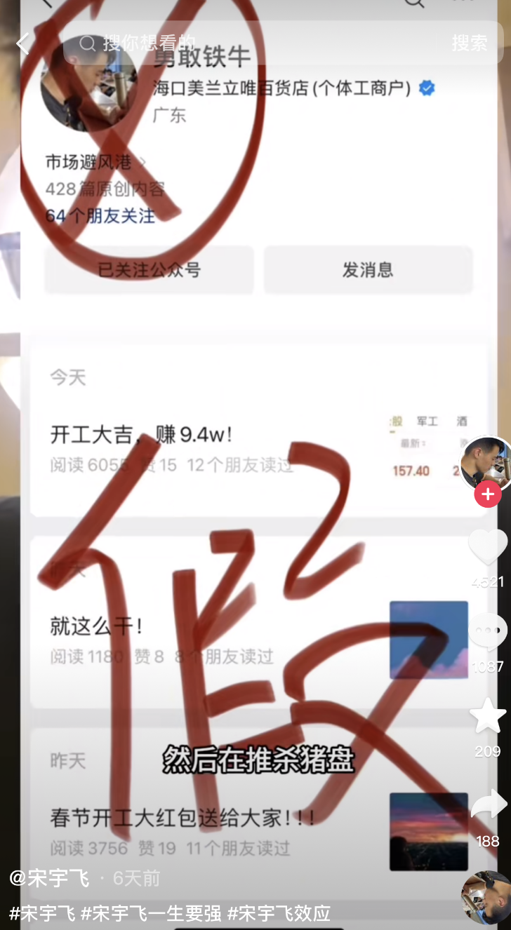 起初“爱理财的小羊”并没有具体点名,只是提醒自己的粉丝不要相信某些财经公众号博主,随后“爱理财的小羊”直接曝光了该博主,并于2月24日到今日,连续三天在账号内发布视频炮轰宋宇飞这一“割韭菜”的行为。