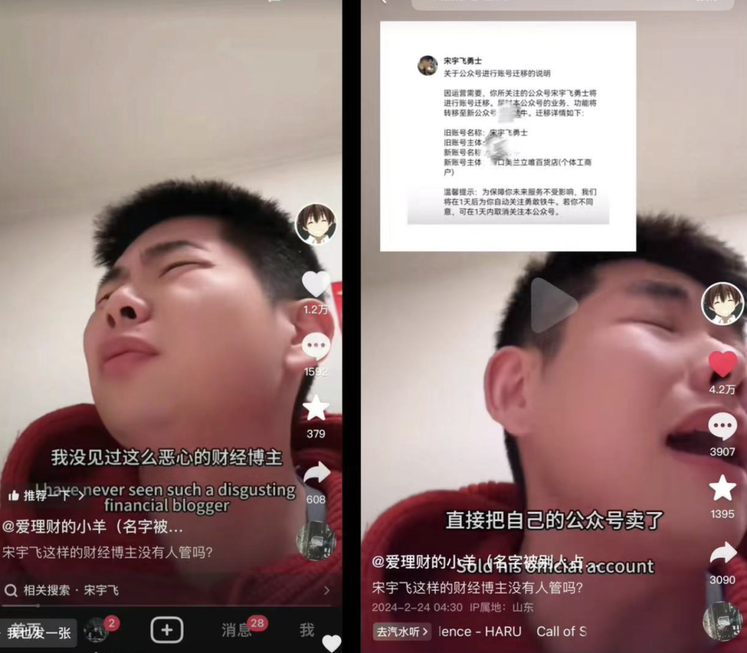 连日来百万粉丝抖音博主“爱理财的小羊”,在账号内发布多条视频,炮轰财经博主“宋宇飞”把公众号卖给杀猪盘,割粉丝韭菜。