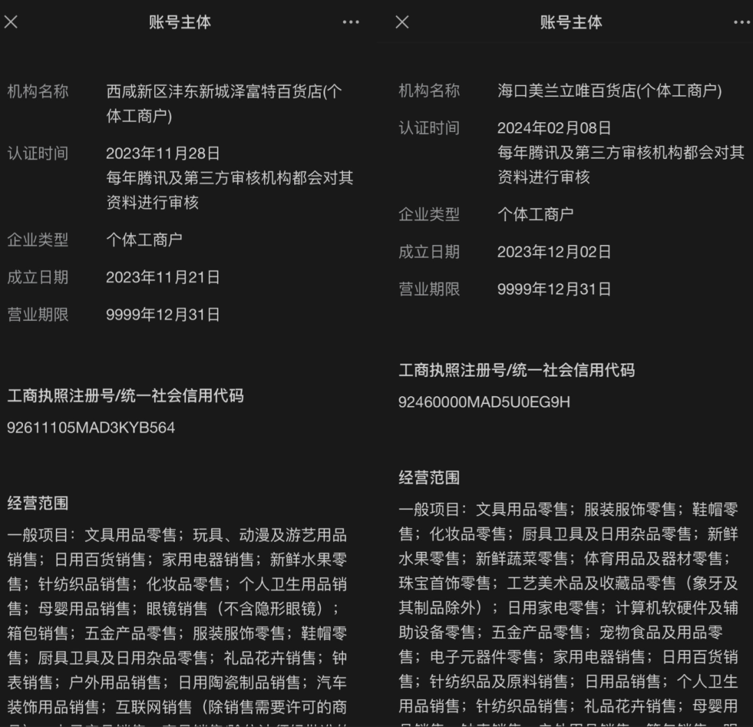 值得注意的是,“勇敢铁牛”与“逻辑盘中胜手”两个相互导流的公众号,其账号主体均为个体工商户,前者认证为海口美兰立唯百货,后者认证为西咸新区沣东新城泽富特百货店,经营范围均是零售日用品,与财经无关,并且注册日期均不到两个月。