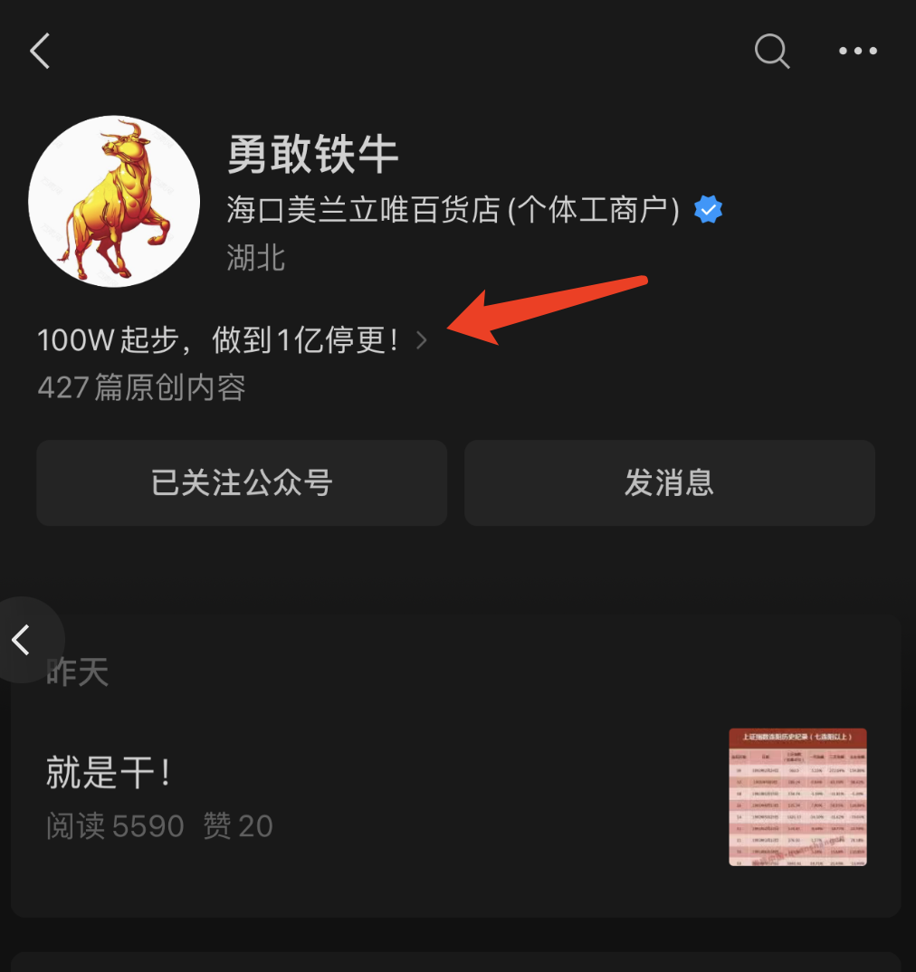 2月7日以后,“勇敢铁牛”更新内容画风突变,该账号扬言要从100W起步,做到1个亿停更,并且每天更新实盘截图。