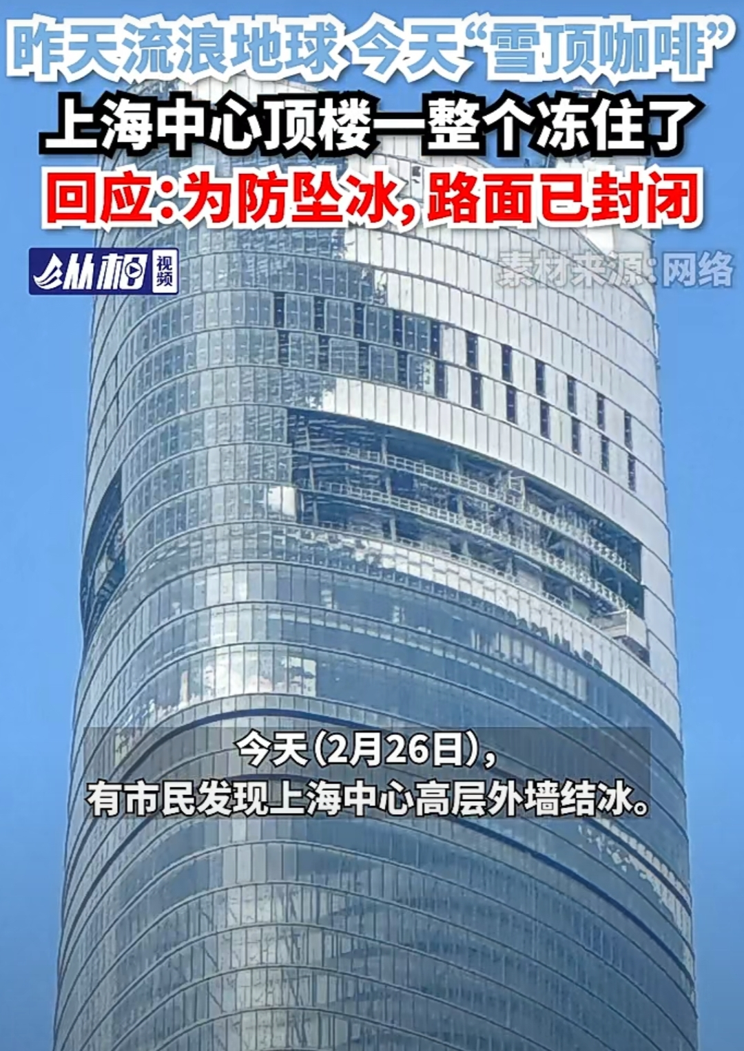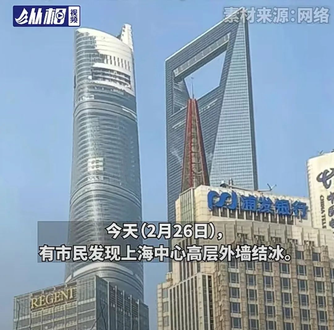 今天(2月26日),有市民发现上海中心高层外墙结冰,“流浪地球”成了“雪顶咖啡”。
