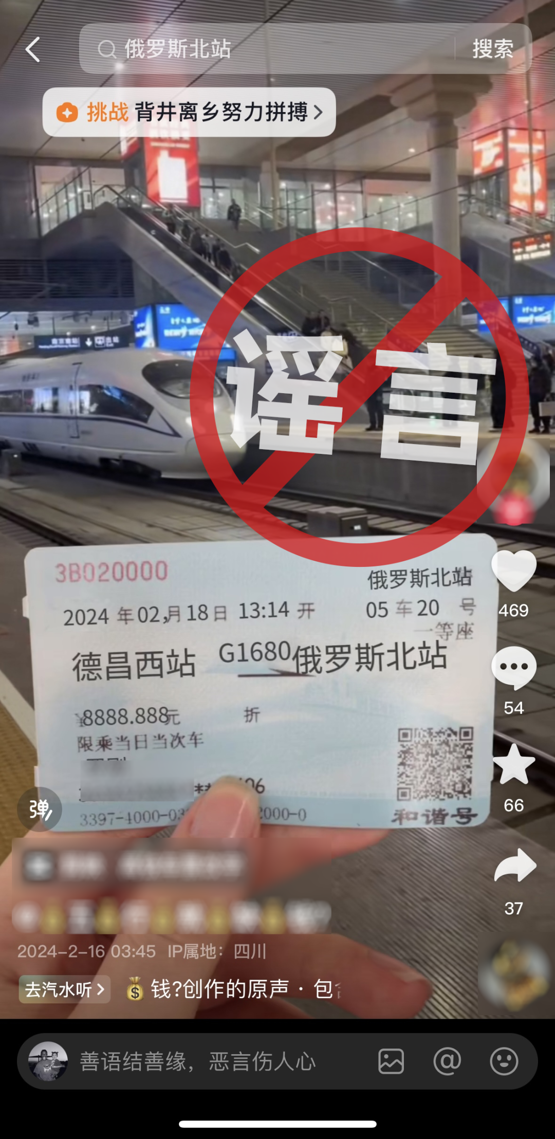 据四川西昌公安消息,2月16日3时许,西昌网民罗某为吸引流量博得关注,使用软件将高铁车票起始点和终点改为“德昌西站-俄罗斯北站”,并在某短视频平台发布自己合成的图片。浏览观看量已达1.7万余次。