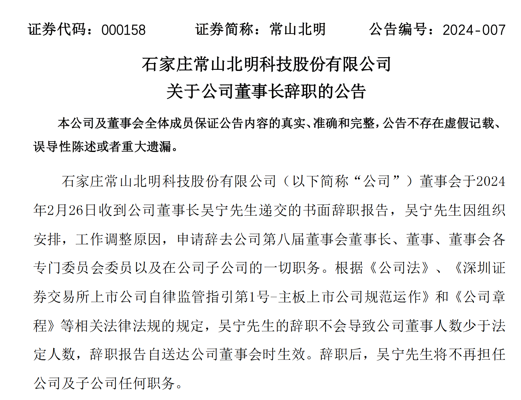 2月26日,常山北明公告,公司董事会于2月26日收到公司董事长吴宁递交的书面辞职报告,吴宁因组织安排,工作调整原因,申请辞去公司第八届董事会董事长、董事、董事会各专门委员会委员以及在公司子公司的一切职务。