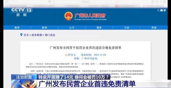 比如,2023年11月,广州发布全国首个民营企业首次违法合规免责清单,出台《民营企业首次违法合规免责清单(第一批)》,针对人力资源社会保障局、市场监管局、城市管理综合执法局、农业农村局等部门在日常执法过程中出现的,可以不予处罚的轻微情节作出列举。