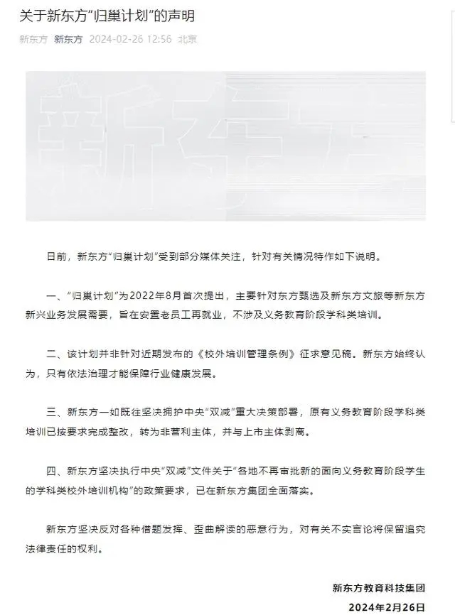 新东方教育科技集团2月26日发布声明称,日前,新东方“归巢计划”受到部分媒体关注,针对有关情况特作如下说明。
