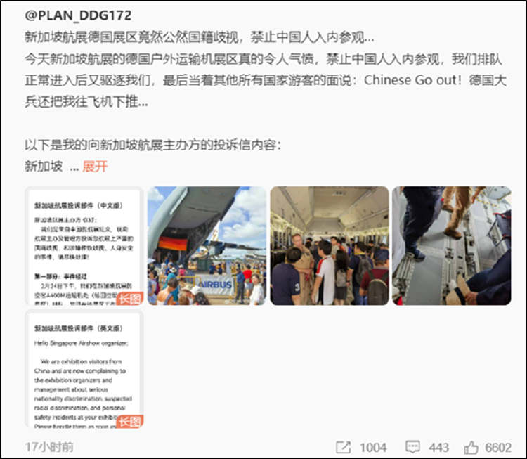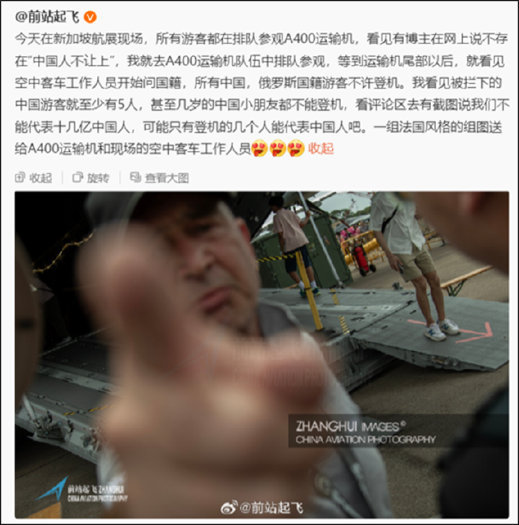 “新加坡航展期间一德国空军运输机拒绝中国籍游客参观”?空客官微回应