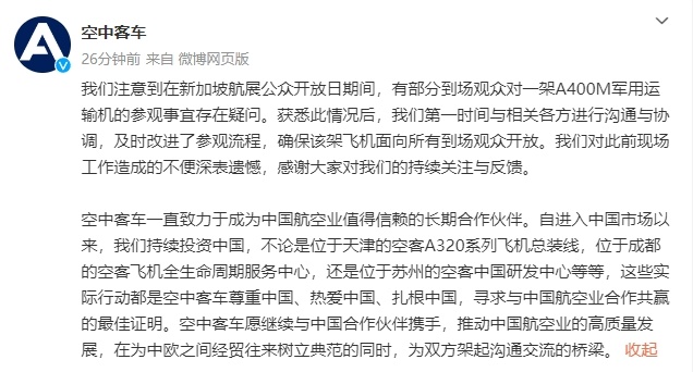 @空中客车消息,我们注意到在新加坡航展公众开放日期间,有部分到场观众对一架A400M军用运输机的参观事宜存在疑问。获悉此情况后,我们第一时间与相关各方进行沟通与协调,及时改进了参观流程,确保该架飞机面向所有到场观众开放。我们对此前现场工作造成的不便深表遗憾,感谢大家对我们的持续关注与反馈。