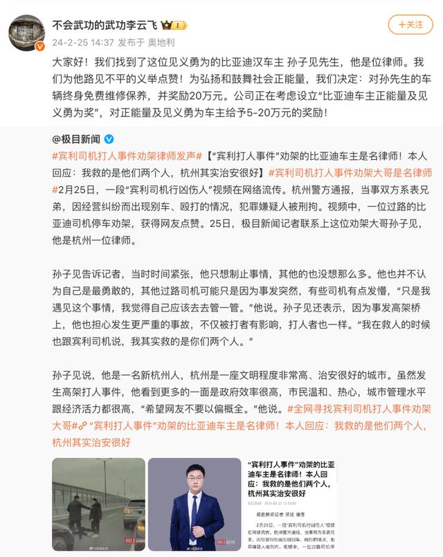 25日下午,比亚迪集团品牌及公关处总经理李云飞在微博表示,已找到这位见义勇为的比亚迪汉车主孙子见,他是位律师。比亚迪决定:对孙先生的车辆终身免费维修保养,并奖励20万元。公司正在考虑设立“比亚迪车主正能量及见义勇为奖”,对正能量及见义勇为车主给予5-20万元的奖励。