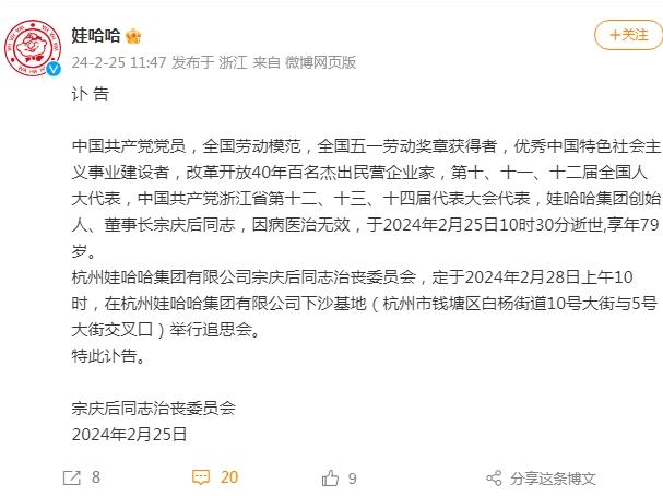 娃哈哈集团官方微博25日发布讣告:娃哈哈集团创始人、董事长宗庆后同志,因病医治无效,于2024年2月25日10时30分逝世,享年79岁。