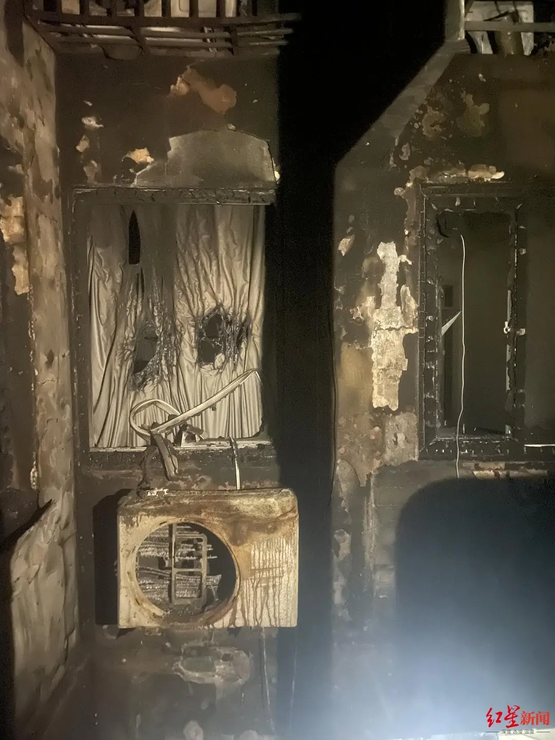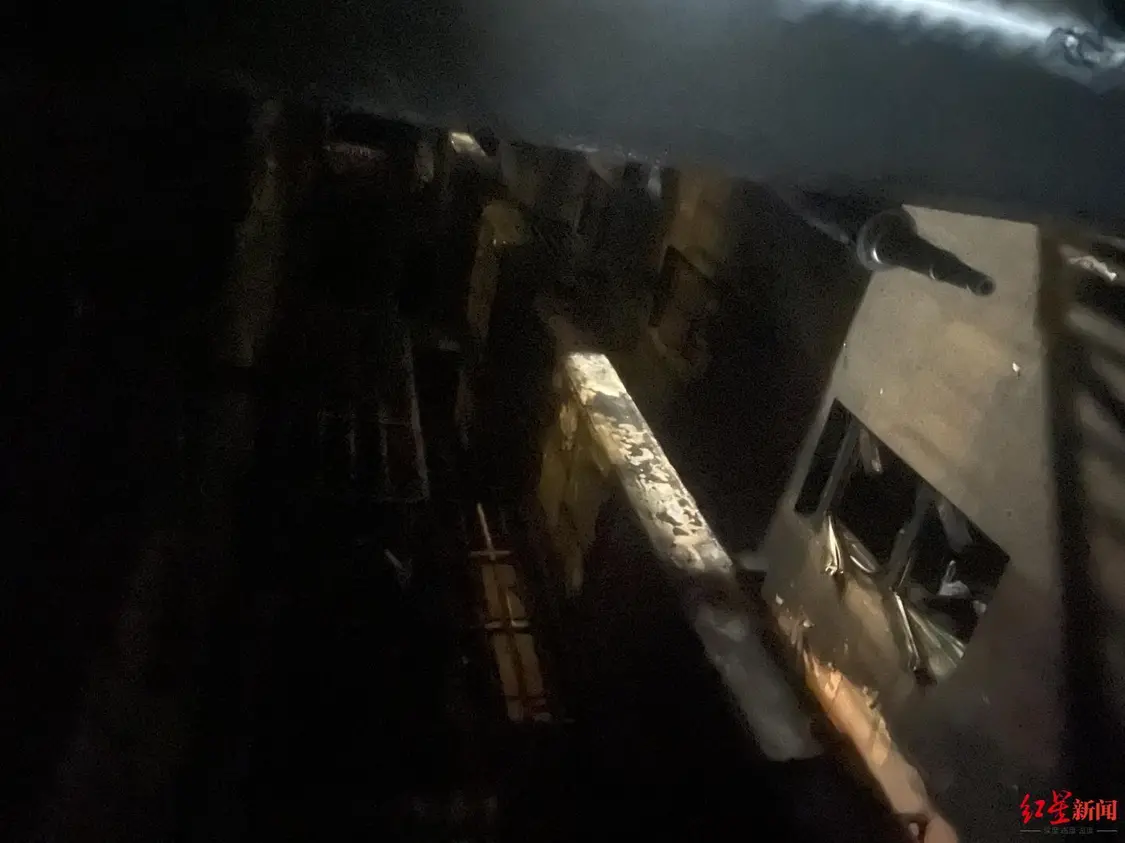红星新闻记者获取的照片显示,在该公寓约中间位置,有一垂直天井,天井连通各楼层与1楼架空层。透过天井,可以看到1楼架空层有大量电动车残骸,2楼有空调外机扇叶消失、部分窗帘被毁、窗户玻璃缺失,2楼以上有部分烟熏痕迹。